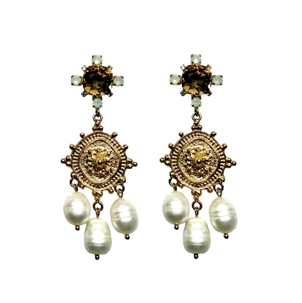 Beautiful composition with references to ethnic jewellery. 24k gold plated vintage brass, Swarovski pearls and baroque pearls. Silver pins. Hand made in Athens, Greece. Approx. 8cm.