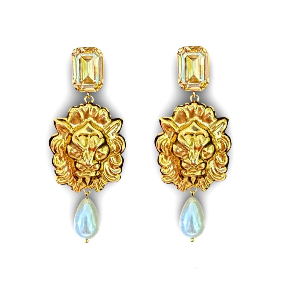 Eye catching statement earrings. Light weight. Swarovski crystals and pearls, 24k gold plated brass lion head, silver posts. Approx. 8 cm. Hand made in Athens, Greece.