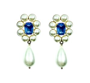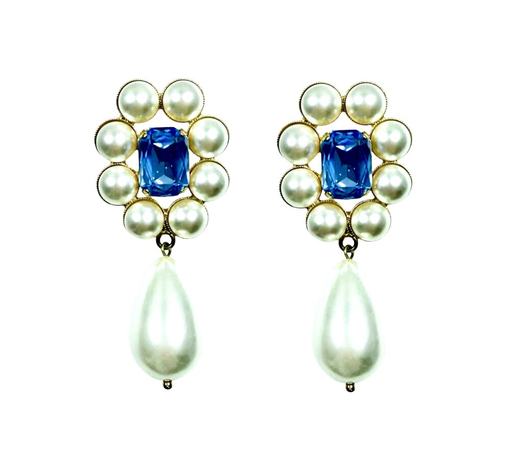 Beautiful, light weight pearl and Swarovski earrings. 24k gold plated brass. Hand made in Athens, Greece. Approx. 6 cm long. The crystal appears in a more strong blue color here, than in daylight.